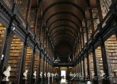 都柏林的三一学院成立于1592年,伊丽莎白一世的皇家特许令批准"在这个荒芜和愚昧的国家建立一所学院和一个文学的摇篮。"在另一个意义上,它是在爱尔兰保持英国生活方式的一个新教中心。学院从1594年起开始招生,但由于没有经费购买图书,所以六年之后,图书馆仍只有43册书。但是历史发展到今天,一切不可同日而语,馆藏数万本图书足够让你惊叹。
